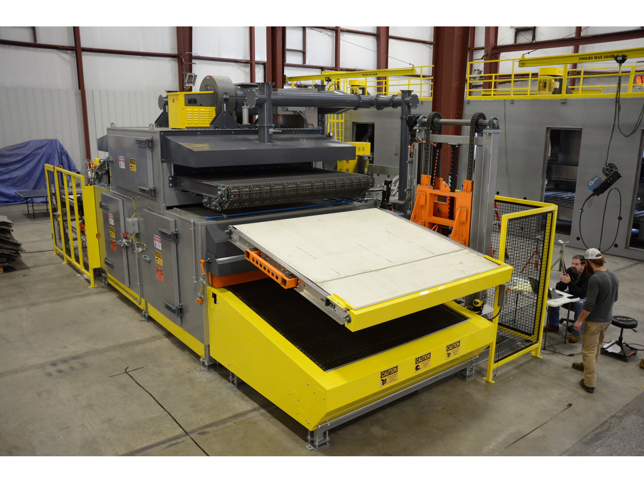 | Product Support | Indexing lift conveyor for loading the Barrier Oven, and a fixed indexing conveyor for the Pad Oven. Both products merge onto a transfer conveyor which delivers them to a forming press. |