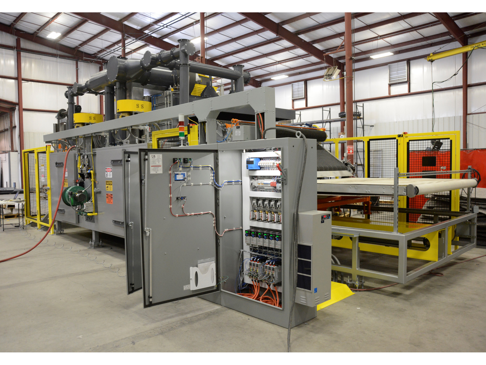 The DTI-1372 design velocity accounts for the pressure drop through the product to provide an efficient process. The systems conveyors provide a stable surface to support the product and is open to allow process air to flow freely through the product, where possible. The design of the conveyors allow the customer to load and unload product easily. The conveyor belts travel approximately 8 feet in just 6 seconds to move into and out of the heated chamber quickly. The oven and transfer conveyor systems do not required any special foundations or floor pits for installation. The control system includes PLC control of the ramp and soak temperature profiles and starting sequence for all components and flame safety systems. All functions are controlled from the operator HMI (touch screen) and multiple recipes can be stored for future use for various product requirements. The entire system is fully assembled and factory tested for operational verification prior to shipment.
