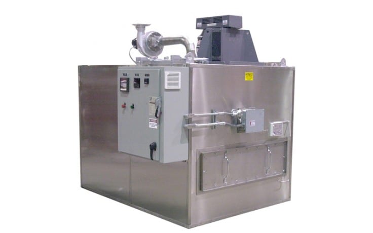 The batch oven utilizes a structural steel framework internal to the insulated walls. The batch oven’s interior and product cart are constructed of 304 stainless steel with a 2B finish. The exterior of the batch oven is constructed of 304 stainless steel with a #4 brushed finish. All seams in the batch oven are seal welded on the outside to prevent particles from entering the chamber. The batch oven’s chamber airflow is a vertical down / horizontal combination. The air enters the chamber at the top, and the return air openings are located at the bottom of each sidewall. A HEPA filter is included in the air path to provide constant filtering of circulated air.
